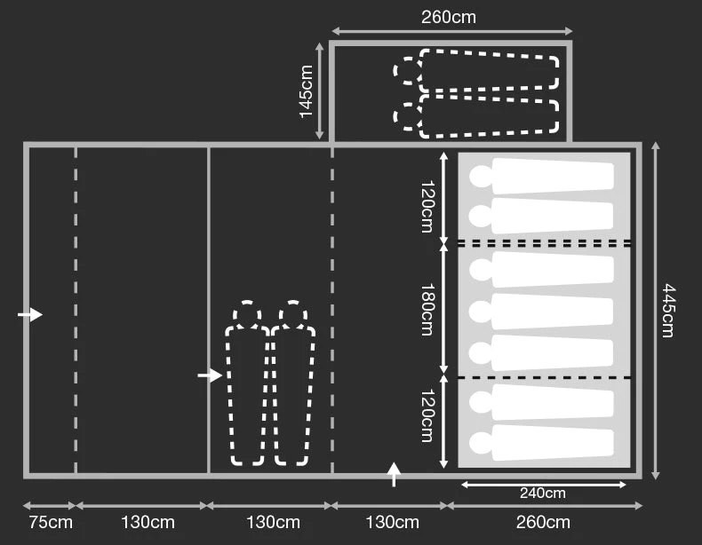 The 6 berth bedroom at the rear is versatile for all sizes of families with its 2+2+2 or 4+2 configuration. allowing the use of 2 children to have there own bedrooms or adults to have 1 large master bedroom . Really useful for those week long camping trips. Due to number of people sleeping here OR have increased the ventilation around the bedroom to allow lots of airflow to keep condensation to a minimum.